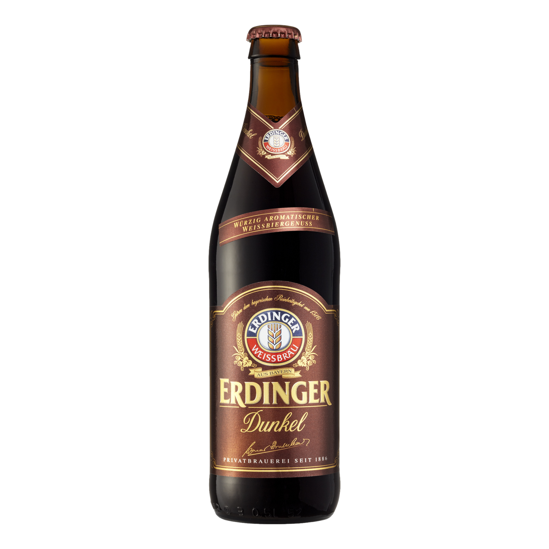 Erdinger Dunkel has aromas of spiced fruit and smooth toffee, a light taste courtesy of quality produced, locally grown Bavarian Hallertau hops with balanced sweet, malty flavours and gently tart fruit, leaving a full bodied, light bitter finish.